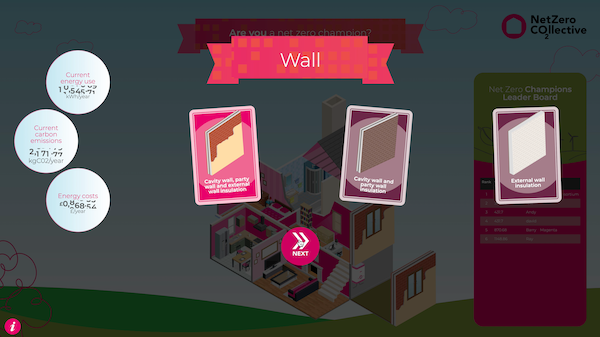 During the game of chance, the player is presented with randomised cards for selection. Choices have an impact upon annualised energy usage, carbon footprint, as well as energy costs.